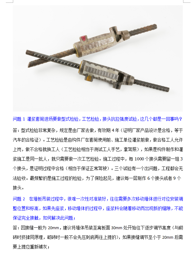 答:型式檢驗非常復雜,規定是由廠家去做,有效期4年(證明廠家產品設計是合格,等于汽車的合格證)。工藝檢驗是由構件廠在套筒使用前、施工單位灌漿前做,做合格工人允許上崗,做不合格就換工人(工藝檢驗相當于測試工人手藝,拿駕照),如果是構件制作和篷漿施工是同一批人,就只需要做一次工藝檢驗。施工過程中,每1000個接頭需要留一組3 個接頭,是證明過程中合格(相當于保證正常駕駛)。三個試驗有一個出問題,工程都會無法驗收。最頻繁的是施工過程的檢驗,為了保險起見,建議每一層制作6個接頭或者9個接頭。