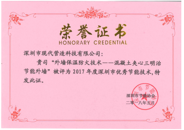 深圳市現(xiàn)代營造科技有限公司作為一個(gè)科技型公司,僅成立短短5年就獲得了深圳市技術(shù)高新企業(yè)、國家高新技術(shù)企業(yè)榮譽(yù)稱號(hào)。其自主研發(fā)的球墨鑄鐵半灌漿套筒、氣壓式灌漿機(jī)分別獲得了ECS工程建設(shè)推薦產(chǎn)品證書、優(yōu)秀產(chǎn)品獎(jiǎng)證書,Thermomass保溫拉結(jié)件獲得了ECS綠色建筑節(jié)能推薦產(chǎn)品證書。由我司總經(jīng)理谷明旺發(fā)明的“外墻保溫防水技術(shù)--混凝土夾心三明治節(jié)能外墻”被評(píng)為2017年度深圳市優(yōu)秀節(jié)能技術(shù)。