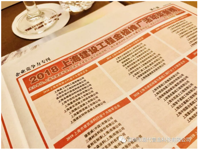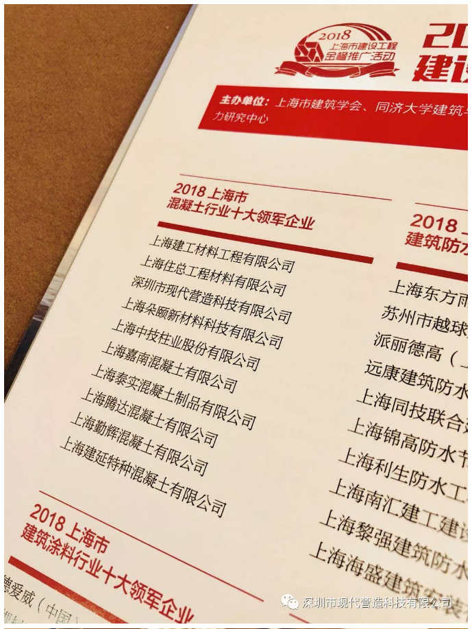 7月19日,由上海市建筑學會、同濟大學建筑與城市規劃學院、上海市建筑材料及構件質量監督檢驗站、上海企業競爭力研究中心等參與主辦的2018第十一屆上海建設工程金楹活動頒獎大會隆重召開。該大會為就建筑建材產業融合與創新、團體標準發展情況、裝配式建筑建材等行業話題進行深入探討,并舉行2018上海建設工程施工、2018上海建設工程材料十大領軍品牌榜頒獎典禮。深圳市現代營造科技有限公司榮獲得“2018上海市建設工程材料金楹獎”,并被評為“2018上海市混凝土行業十大領軍企業”。